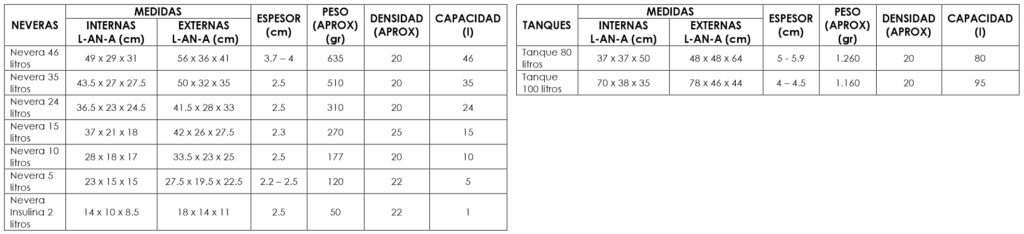 Neveras de Poliestireno Expandido EPS Tipo P (Poliestireno de uso general, Norma Técnica Colombiana NTC 1426, Plásticos. Poliestireno expandible. Especificaciones), de alta densidad, diseñadas para embalaje de alimentos, bebidas y medicamentos en donde es necesario conservar la cadena de frío.